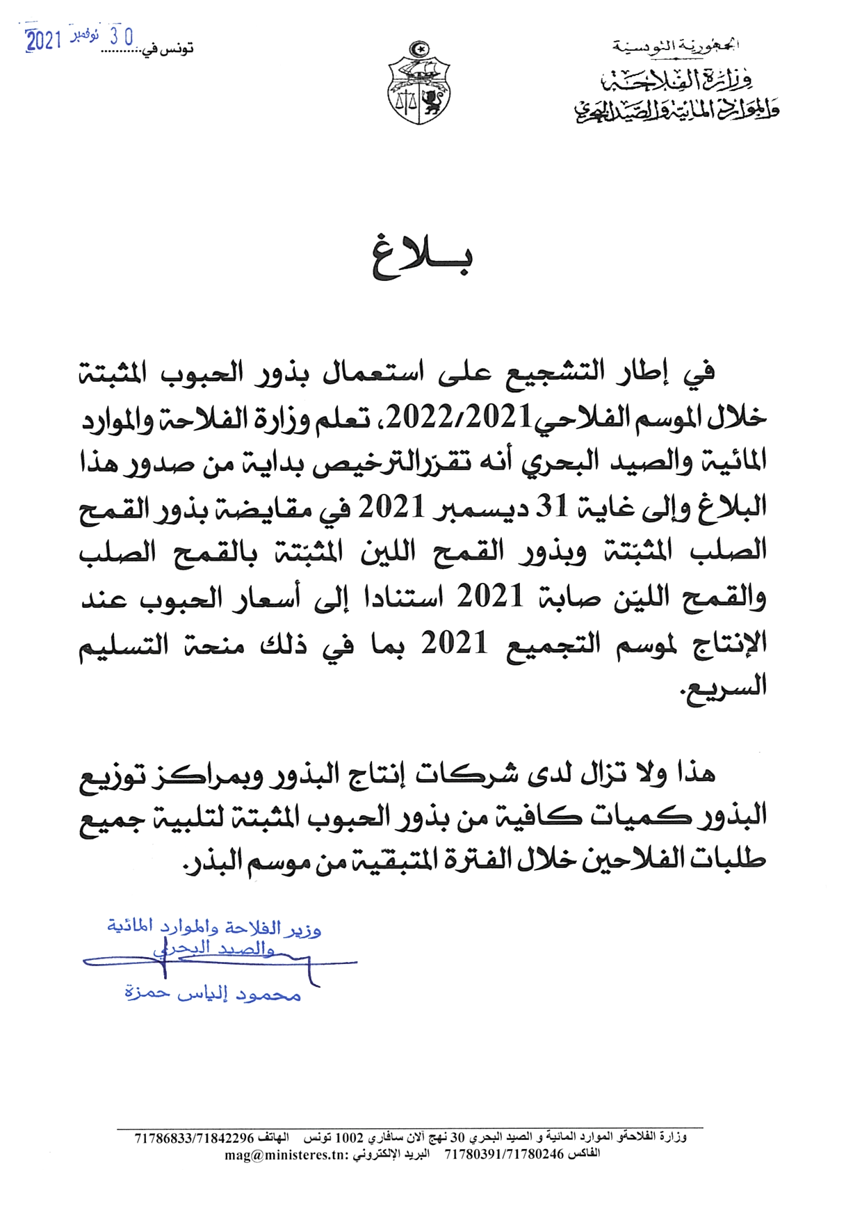 بلاغ حول التّشجيع على استعمال بذور الحبوب المثبّتة خلال الموسم الفلاحي 2021/2022