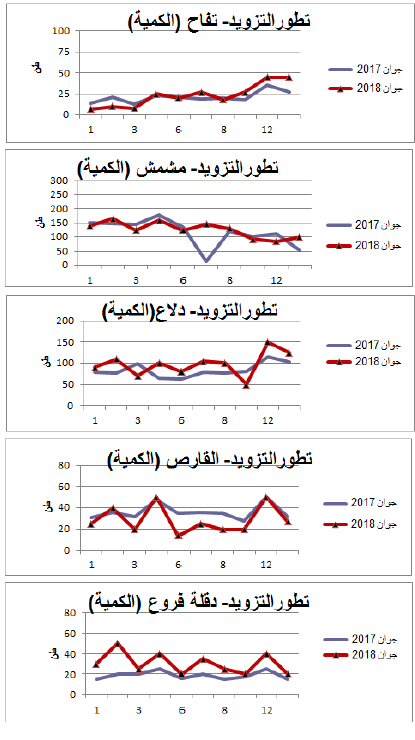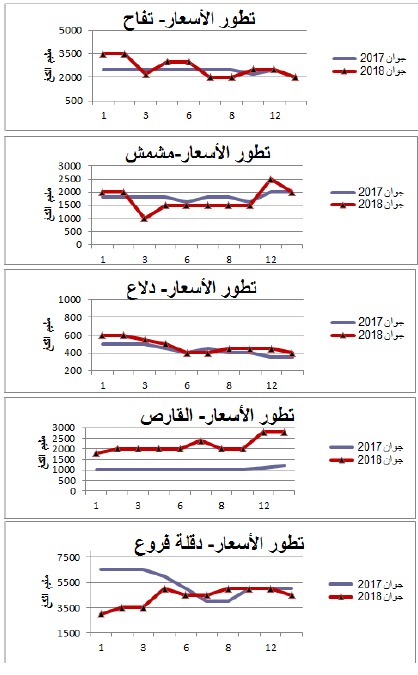 - ارتفاع في الأسعار بالنسبة للقارص والدلاع مقابل انخفاض نسبي بالنسبة للدقلة فروع والمشمش.