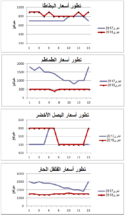 - انخفاض في الأسعار بالنسبة للطماطم (-62%) والفلفل الحار(-40%) وارتفاع نسبي في الأسعاربالنسبة للبصل الأخضر والبطاطا.