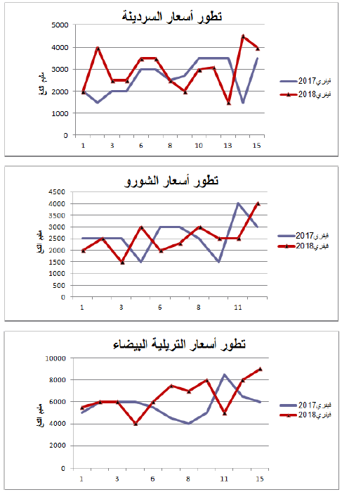 - تراجع في العرض بالنسبة لأغلب أصناف الأسماك وارتفاع في الأسعار بالنسبة للسردينة مقابل انخفاض في الأسعار بالنسبة للشورو والتريلية البيضاء.
