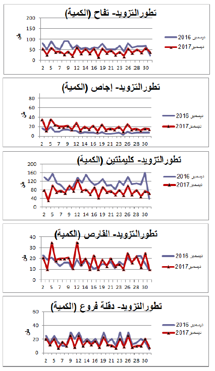 - تراجع في التزويد بالنسبة للتفاح والكليمنتين والدقلة فروع مقابل زيادة في التزويد بالنسبة للإجاص والقارص.