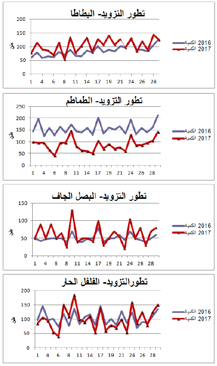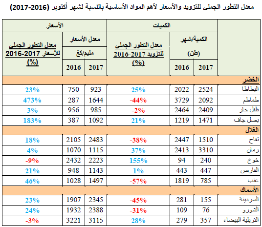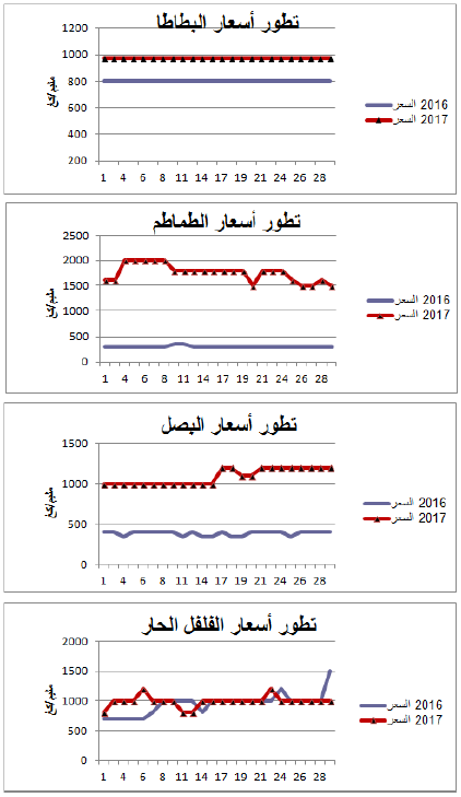- زيادة نسبية في التزويد بالنسبة للبطاطا والبصل الجاف وارتفاع في الأسعار بالنسبة لأغلب أصناف الخضر. ويرجع الإرتفاع الهام في الأسعار بالنسبة للطماطم إلى: