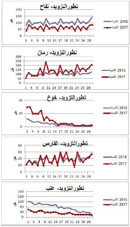 - زيادة في العرض بالنسبة للرمان والخوخ مقابل تراجع بالنسبة للتفاح والعنب.