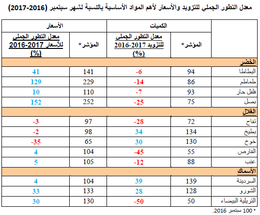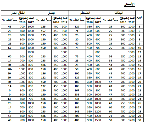 البصل : ارتفاع في الأسعار مقارنة بنفس الفترة من سنة 2016 ويقدر مؤشرالأسعار بـ252.