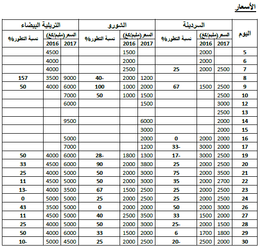 الشورو : ارتفاع في الأسعار مقارنة بنفس الفترة لسنة 2016 ويقدر مؤشر الأسعار بـ133.