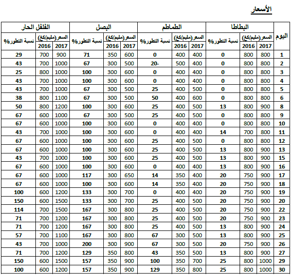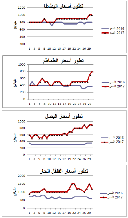 البصل : ارتفاع في الأسعار مقارنة بنفس الفترة من سنة 2016 ويقدر مؤشرالأسعار بـ217.