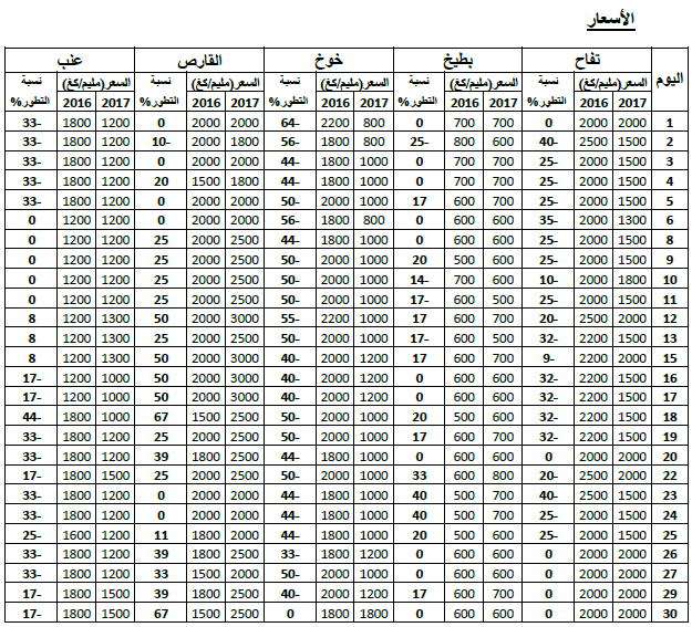 العنب : انخفاض في الأسعار مقارنة بنفس الفترة لسنة 2016 ويقدر مؤشر الأسعار بـ78.