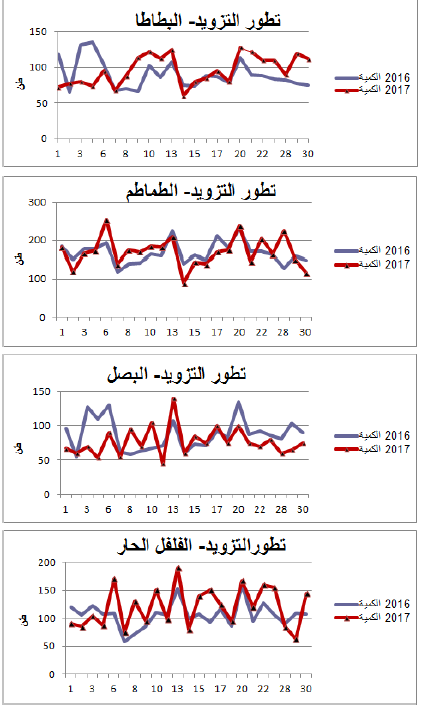 - زيادة نسبية في التزويد بالنسبة للبطاطا والطماطم والفلفل الحار مقابل تراجع نسبي بالنسبة للبصل.
