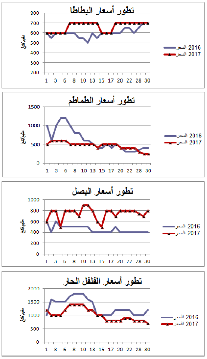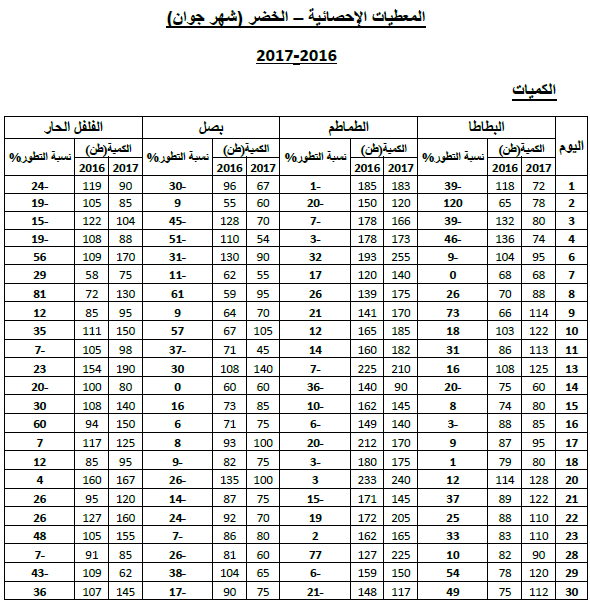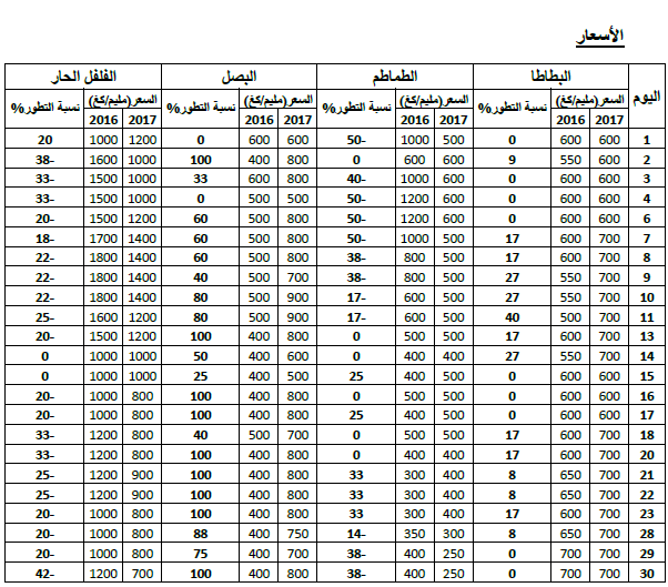 - ارتفاع في الأسعار بالنسبة للبصل والبطاطا مقابل انخفاض بالنسبة للطماطم والفلفل الحار.