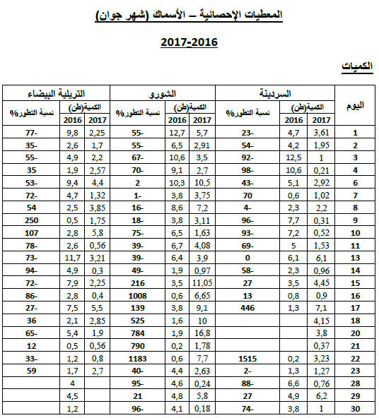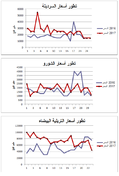 - تراجع في العرض بالنسبة للسردينة والتريلية البيضاء انجر عنه ارتفاع في الأسعار مقابل زيادة في العرض بالنسبة للشورو وارتفاع نسبي في الأسعار.