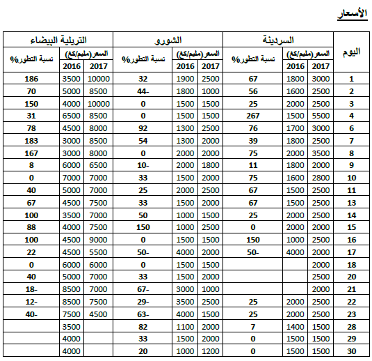 الشورو : ارتفاع نسبي في الأسعار مقارنة بنفس الفترة لسنة 2016 ويقدر مؤشرالأسعار بـ110.