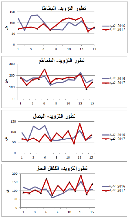 - زيادة نسبية في التزويد بالنسبة للفلفل الحار والطماطم مقابل تراجع نسبي بالنسبة للبصل والبطاطا.