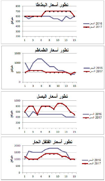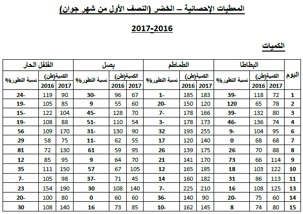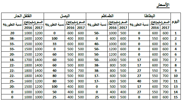 - ارتفاع في الأسعار بالنسبة للبصل والبطاطا مقابل انخفاض بالنسبة للطماطم والفلفل الحار.