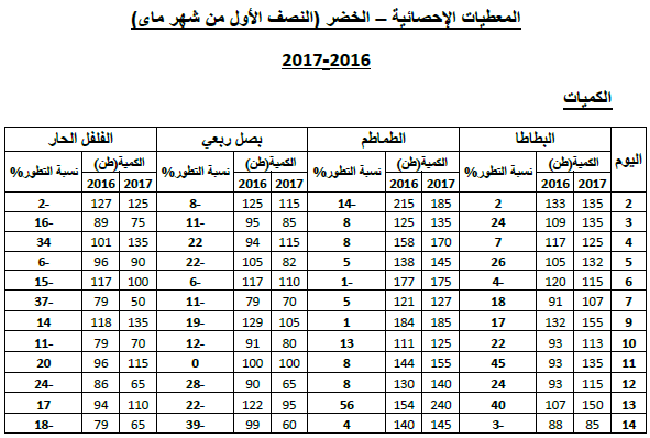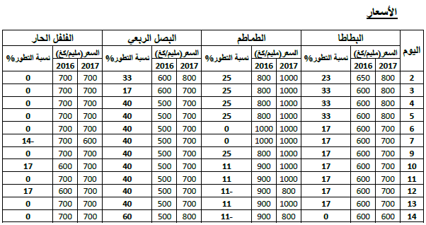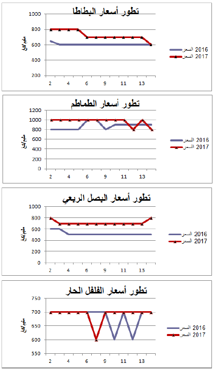 - تراجع نسبي في التزويد بالنسبة للفلفل الحار والبصل الربعي مقابل زيادة نسبية بالنسبة للبطاطا والطماطم.