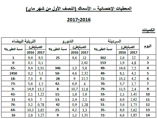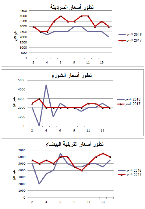 - تراجع في العرض بالنسبة للسردينة والتريلية البيضاء مقابل زيادة نسبية بالنسبة للشورو وارتفاع نسبي في الأسعار بالنسبة لأغلب أصناف الأسماك.