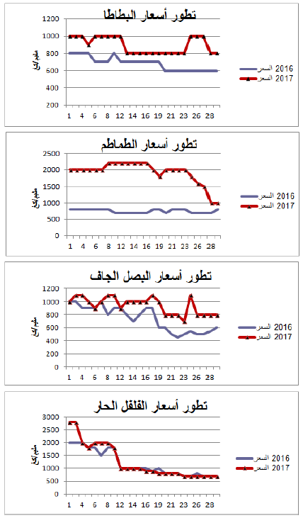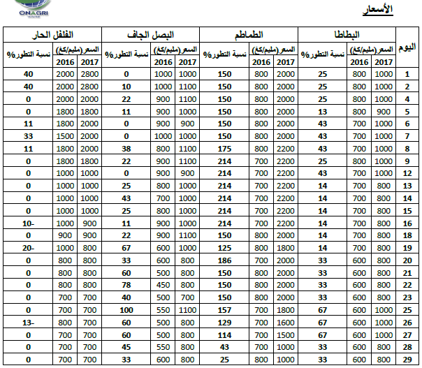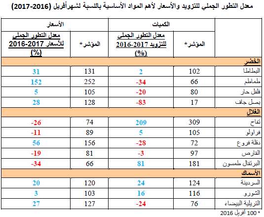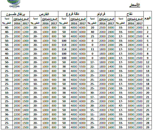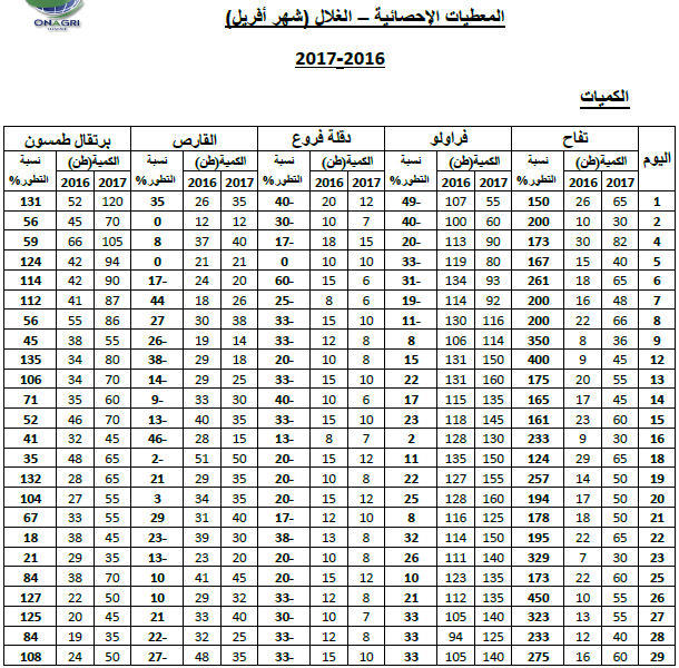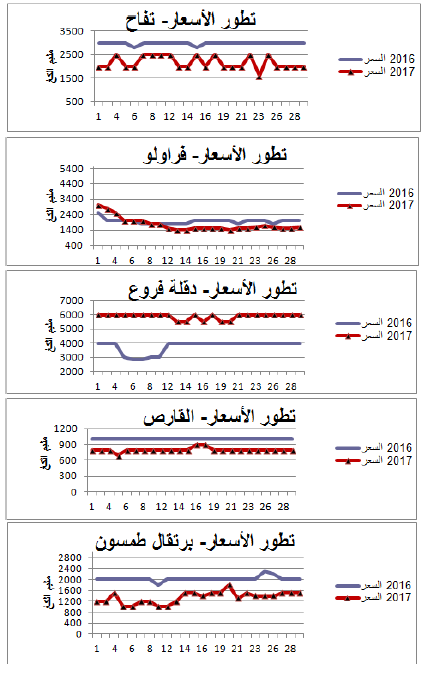 القارص: انخفاض نسبي في الأسعار مقارنة بنفس الفترة من سنة 2016 ويقدر مؤشرالأسعار بـ81.البرتقال طمسون: انخفاض في الأسعار مقارنة بنفس الفترة لسنة 2016 ويقدر مؤشر الأسعار بـ66.