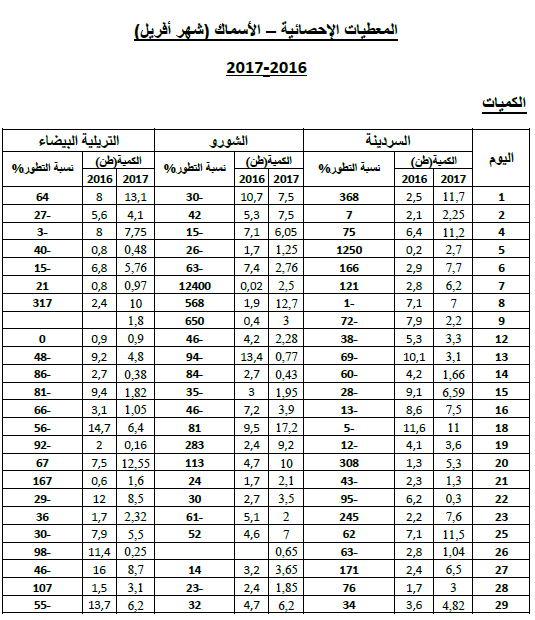 السردينة :زيادة نسبية في التزويد مقارنة بنفس الفترة من سنة 2016 ويقدر مؤشر الكميات بـ 124.