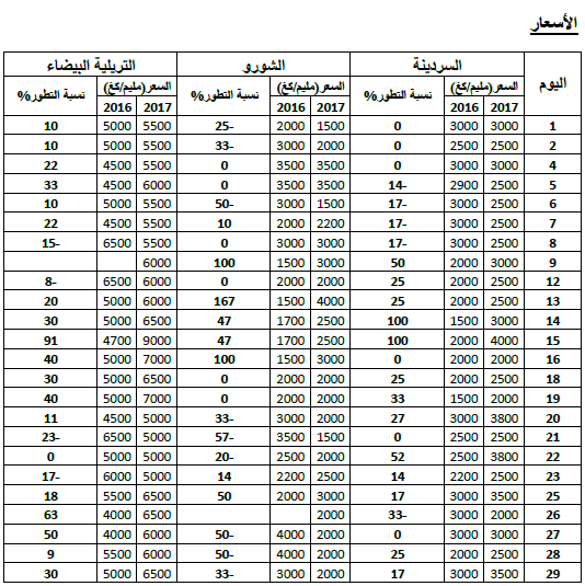 الشورو : استقرار نسبي في الأسعار مقارنة بنفس الفترة لسنة 2016 ويقدر مؤشرالأسعار بـ103.