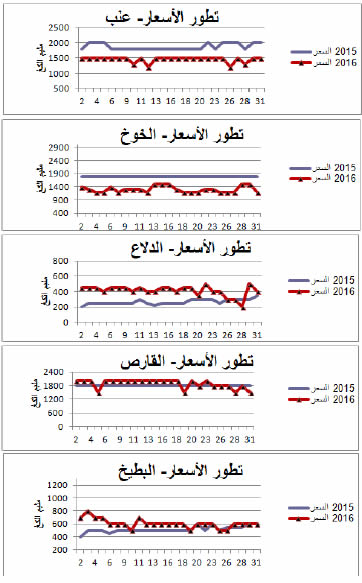 العنب : انخفاض نسبي في الأسعار مقارنة بنفس الفترة من سنة 2015 ويقدر مؤشرالأسعار بـ78.