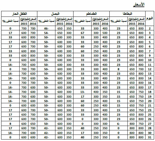 - ارتفاع نسبي في الأسعار بالنسبة لأغلب أصناف الخضر ما عدى البصل (-49%).