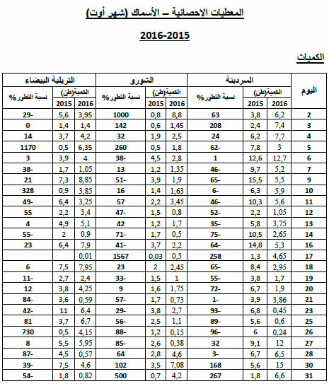 - ارتفاع في الأسعار بالنسبة للسردينة (+24%) والشورو(+15%) مقابل انخفاض بالنسبة للتريلية البيضاء (-12%).