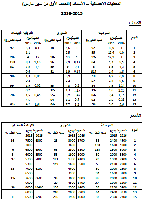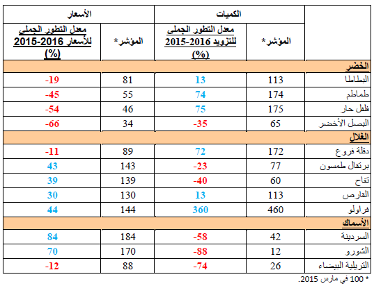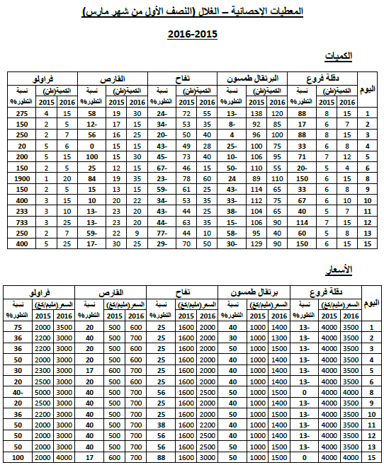 معدل التطور الجملي للتزويد والأسعار لأهم المواد الأساسية بالنسبة للنصف الأول من شهر مارس (2015-2016)