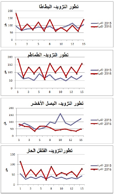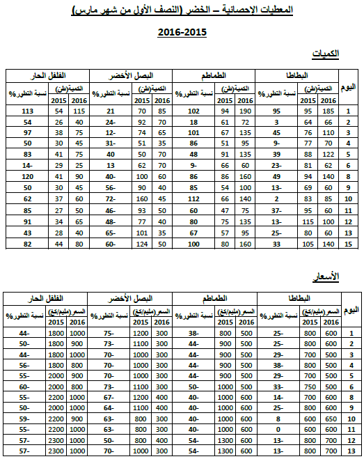 - زيادة في التزويد بالنسبة لأغلب أصناف الخضر ما عدى البصل الأخضر(-35%) انجر عنها انخفاض في الأسعار.