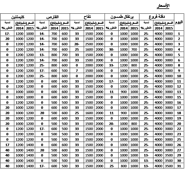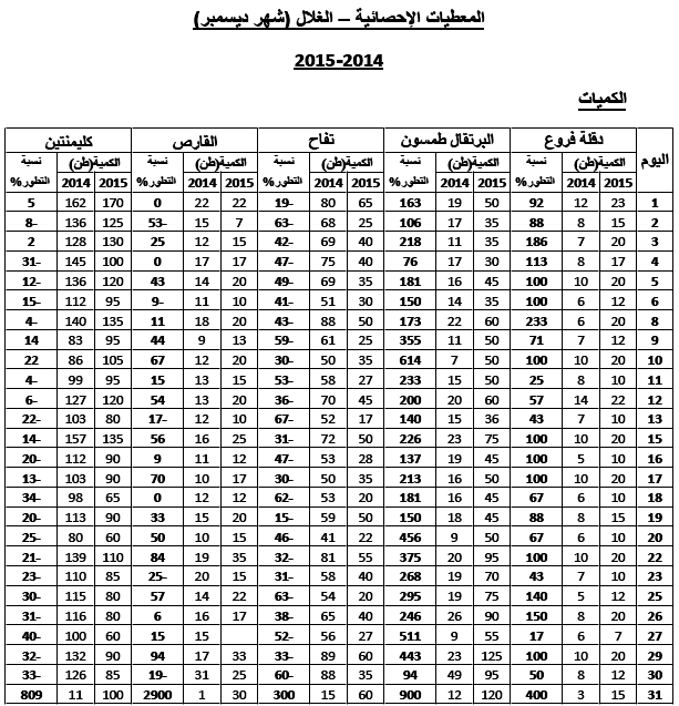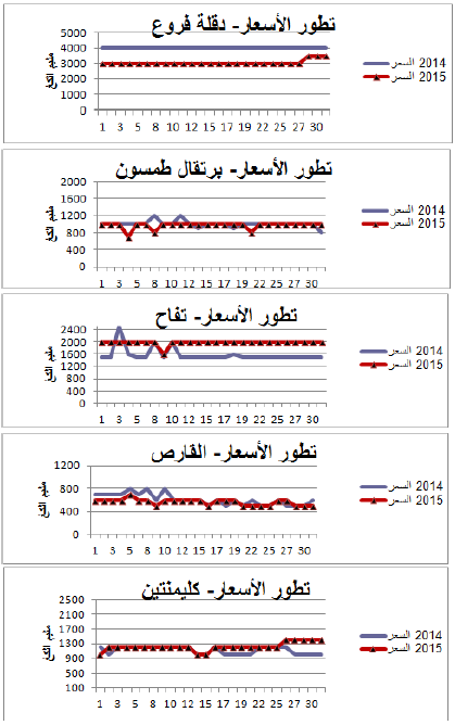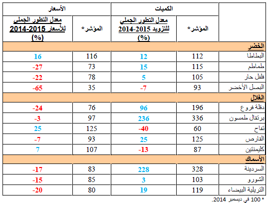 القارص انخفاض نسبي في الاسعار مقارنة بنفس الفترة من سنة 2014 ويقدر مؤشر الاسعار بـ 93.