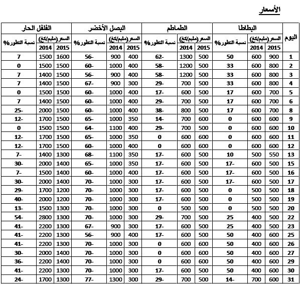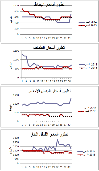 - انخفاض في الأسعار بالنسبة لأغلب أصناف الخضر ماعدى البطاطا (+16%).