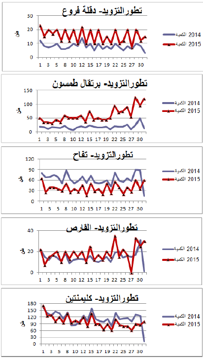 - زيادة في التزويد بالنسبة لأغلب أصناف الغلال ما عدى التفاح (%40-) والكليمنتين (-13%).