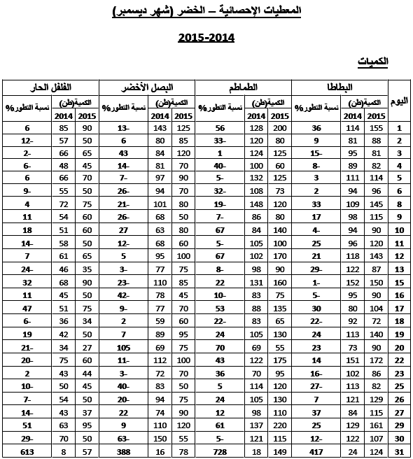 - زيادة في التزويد بالنسبة لأغلب أصناف الخضر ماعدى البصل الأخضر(-7%).