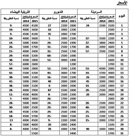 الشورو: انخفاض نسبي في الأسعار مقارنة بنفس الفترة لسنة 2014 ويقدر مؤشرالأسعار بـ85.