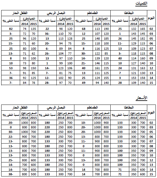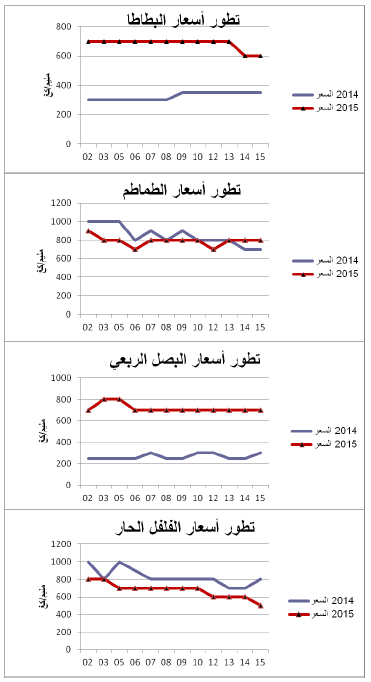 - ارتفاع في الأسعار بالنسبة للبصل (+169%) والبطاطا (+110%) مقابل انخفاض بالنسبة للفلفل الحار(-19%) والطماطم (-7%).