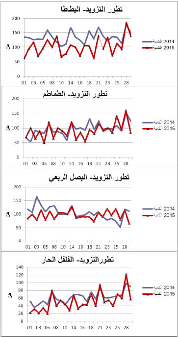 - تراجع نسبي في التزويد بالنسبة للبطاطا (-23%)، الفلفل الحار(-16%) والبصل الربعي (-8%) مقابل استقرار التزويد بالنسبة للطماطم.