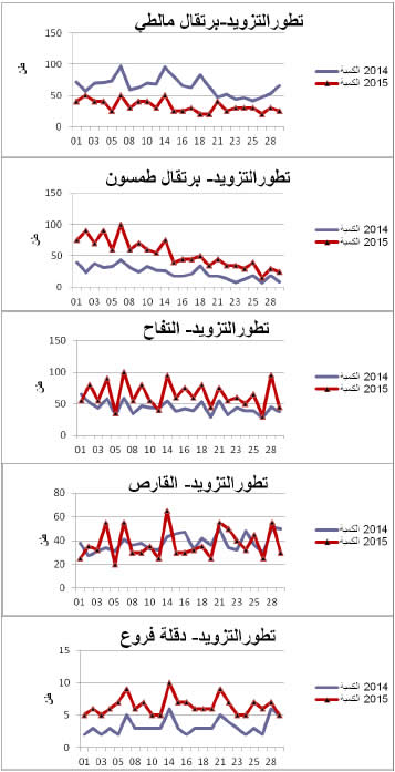 برتقال مالطي: تراجع في التزويد مقارنة بنفس الفترة من سنة 2014 ويقدر مؤشر الكميات بـ 50 .
