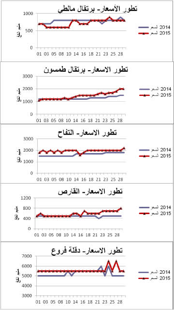 برتقال مالطي : انخفاض نسبي في الأسعار مقارنة بنفس الفترة من سنة 2014 ويقدر مؤشر الأسعار بـ93.