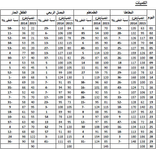 الطماطم: استقرار نسبي في التزويد مقارنة بنفس الفترة من سنة 2014 ويقدر مؤشر الكميات بـ 97.
