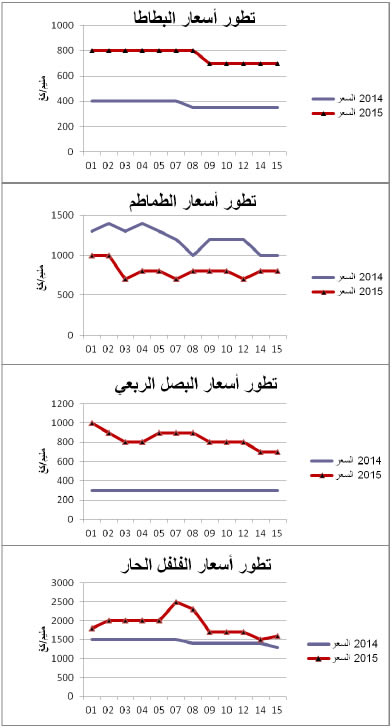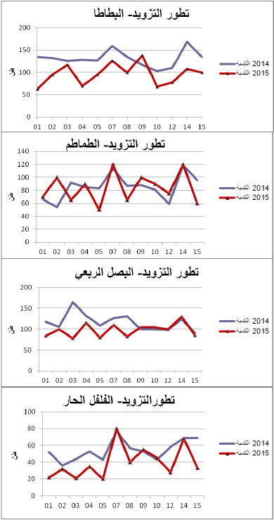 - تراجع نسبي في التزويد بالنسبة للبطاطا (-27%)، الفلفل الحار(-27%) و البصل الربعي (-16%) مقابل استقرار التزويد بالنسبة       للطماطم.