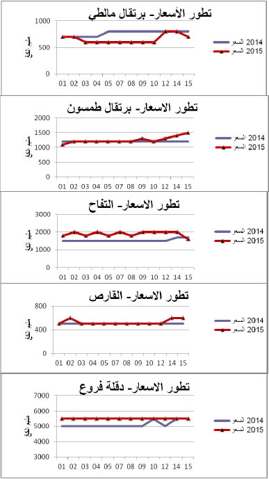 برتقال مالطي : انخفاض نسبي في الأسعار مقارنة بنفس الفترة من سنة 2014 ويقدر مؤشرالأسعار بـ 86.