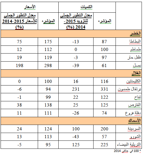 - التفاح: استقرار في الأسعار مقارنة بنفس الفترة من سنة 2014 ويقدر مؤشرالأسعار بـ99.