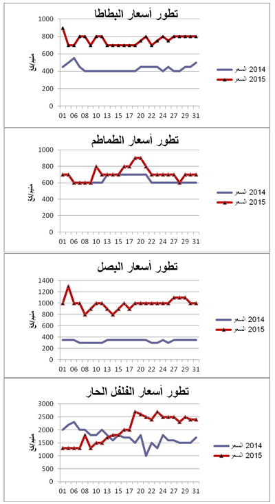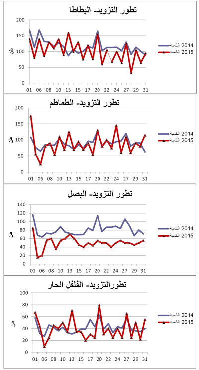 - الفلفل الحار: استقرار نسبي في التزويد مقارنة بنفس الفترة من سنة 2014 ويقدر مؤشر الكميات بـ97.