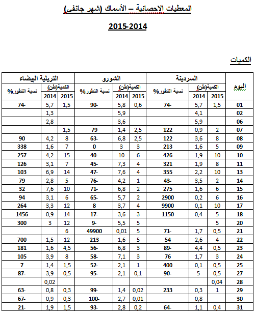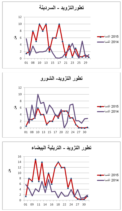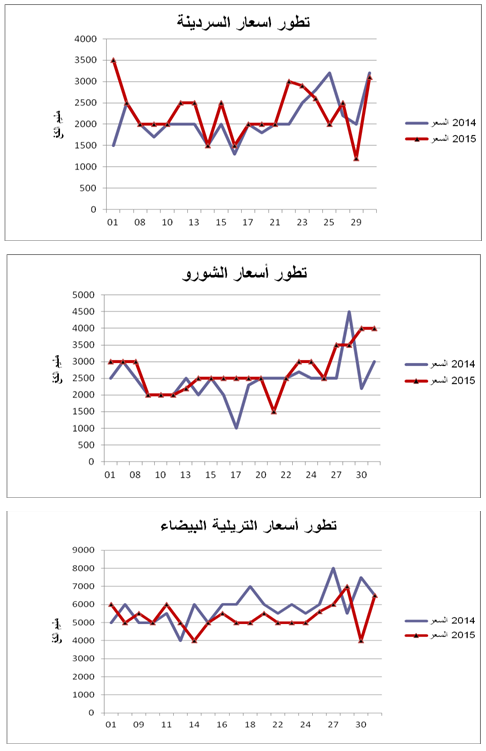 - السردينة : زيادة هامة في التزويد مقارنة بنفس الفترة من سنة 2014 ويقدر مؤشر الكميات بـ 200.
