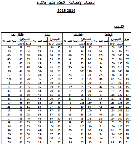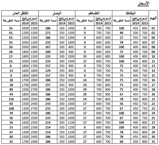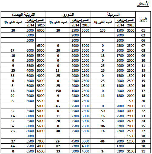 - القارص: ارتفاع في الأسعار مقارنة بنفس الفترة من سنة 2014 ويقدر مؤشرالأسعار بـ138.