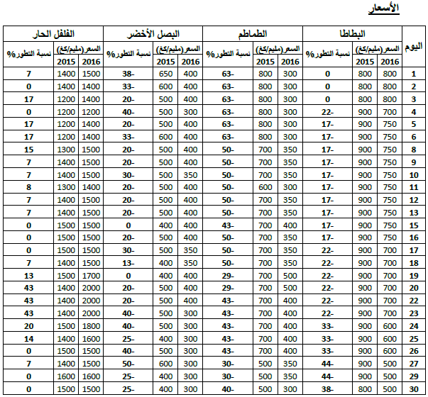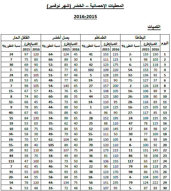 - انخفاض في الأسعار بالنسبة لأغلب أصناف الخضر ما عدى الفلفل الحار (+12%).