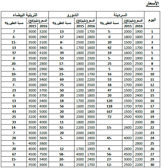 الشورو: ارتفاع نسبي في الأسعار مقارنة بنفس الفترة لسنة 2015 ويقدر مؤشر الأسعار بـ118.