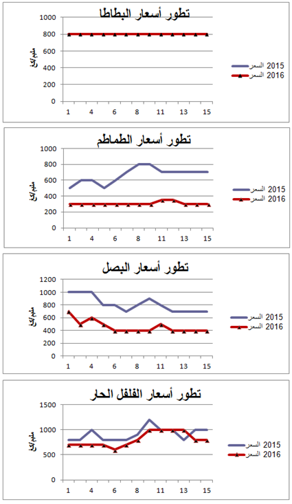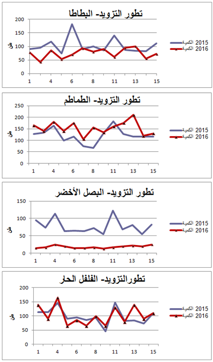 - تراجع في التزويد بالنسبة للبصل الأخضر(-77 %) والبطاطا (-27 %) مقابل زيادة نسبية بالنسبة للطماطم والفلفل الحار.