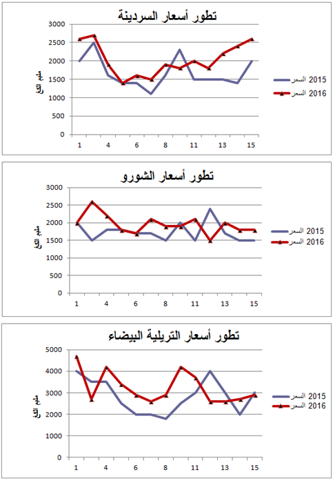 - زيادة في العرض بالنسبة للسردينة (43 %) والشورو (110 %) مقابل تراجع بالنسبة للتريلية البيضاء (-51 %).