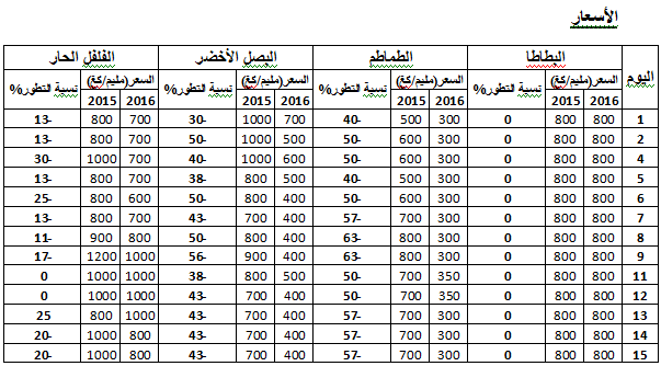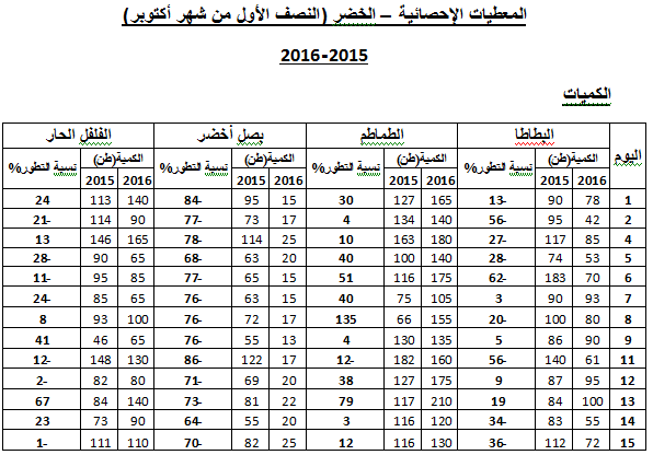 - انخفاض في الأسعار بالنسبة لأغلب أصناف الخضر ما عدى البطاطا.