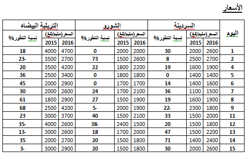 الشورو : ارتفاع نسبي في الأسعار مقارنة بنفس الفترة لسنة 2015 ويقدر مؤشرالأسعار بـ117.