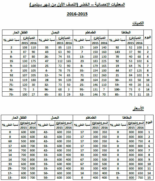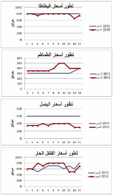 البصل : انخفاض في الأسعار مقارنة بنفس الفترة من سنة 2015 ويقدر مؤشرالأسعار بـ61.